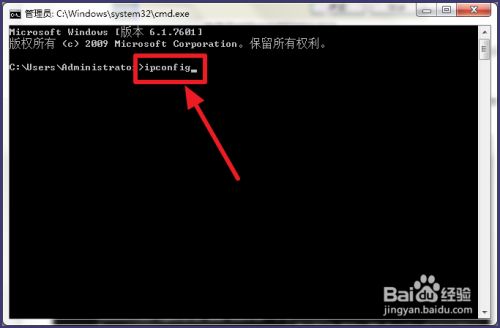 2、然后在打开的窗口种输入「ipconfig」,然后回车